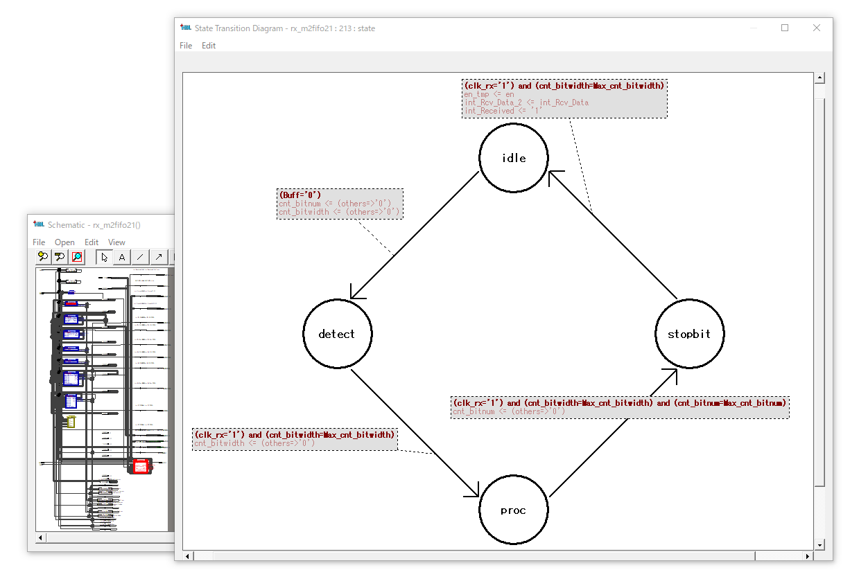 always節(Verilog) / process節(VHDL)では、記述内容をステートマシン図として表示できます。